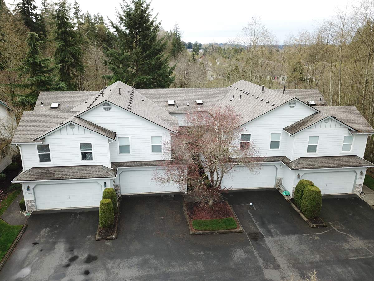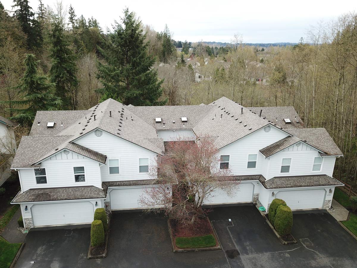 Bothell, WA | 2015Cornerstone Roofing replaced the composition roof on these four townhomes in Bothell with new CertainTeed Landmark Weathered Wood composition shingles.